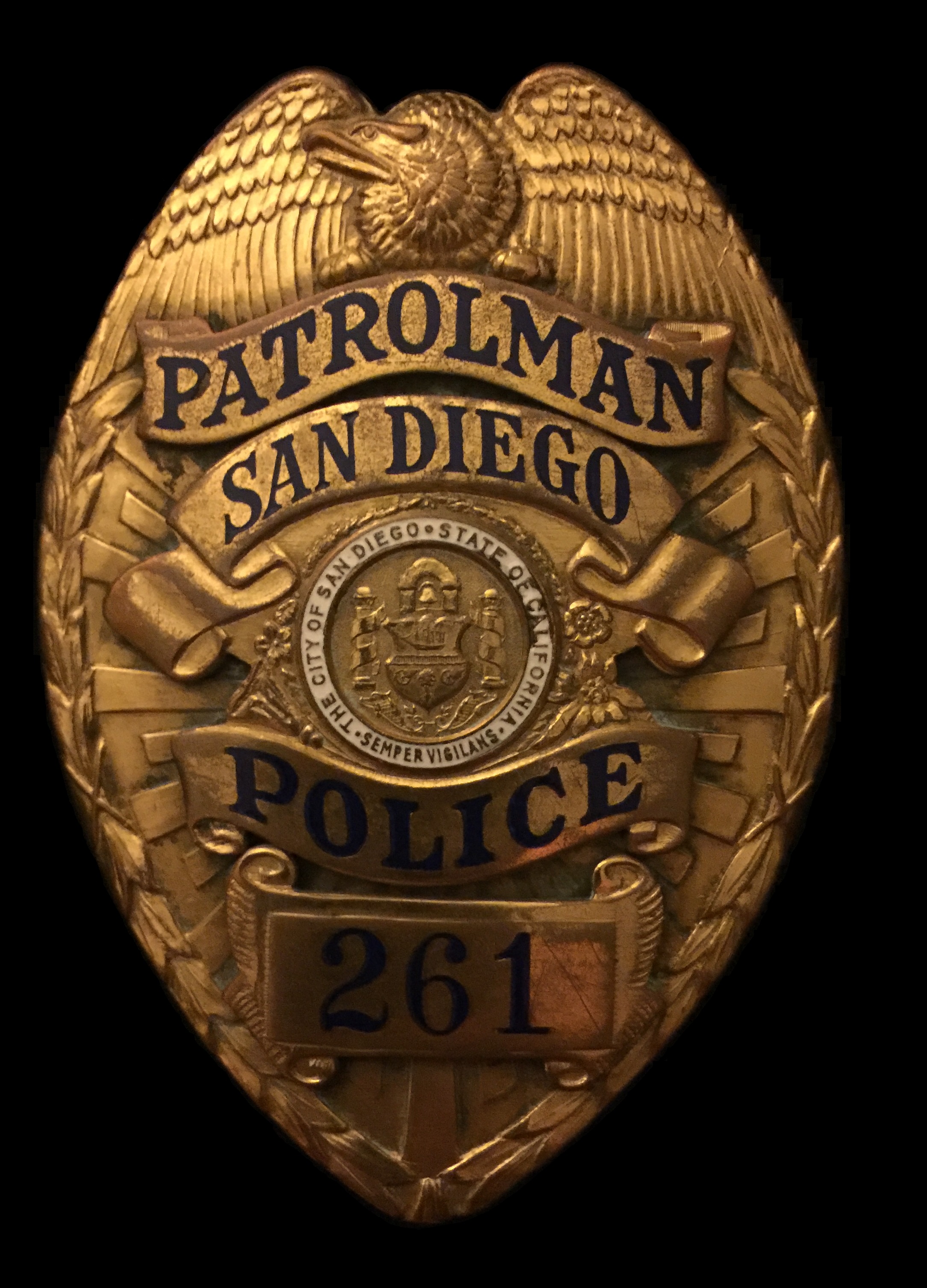 Obsolete badge. Used between 1955-1991. Current SDPD Assistant Chief's badge has 2 stars in control panel.