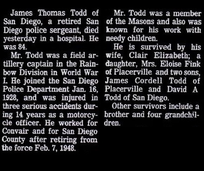 Basic information is provided as a courtesy and is obtained from a variety of sources including public data, museum files and or other mediums. While the San Diego Police Historical Association strives for accuracy, there can be issues beyond our control which renders us unable to attest to the veracity of what is presented. More specific information may be available if research is conducted. Research is done at a cost of $50 per hour with no assurances of the outcome. For additional info please contact us.